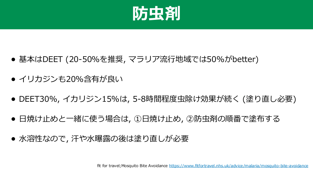 #10. • 基本はDEET (20-50%を推奨, マラリア流⾏地域では50%がbetter) • イリカジンも20%含有が良い • DEET30%, イカリジン15%は, 5-8時間程度⾍除け効果が続く (塗り直し必要) • ⽇焼け⽌めと⼀緒に使う場合は, ①⽇焼け⽌め, ②防⾍剤の順番で塗布する • ⽔溶性なので, 汗や⽔曝露の後は塗り直しが必要 t for travel;Mosquito Bite Avoidance https://www. tfortravel.nhs.uk/advice/malaria/mosquito-bite-avoidance fi fi 防⾍剤