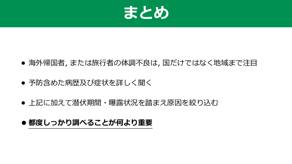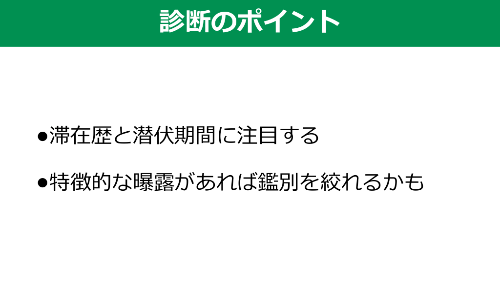 #11. 診断のポイント •滞在歴と潜伏期間に注⽬する •特徴的な曝露があれば鑑別を絞れるかも