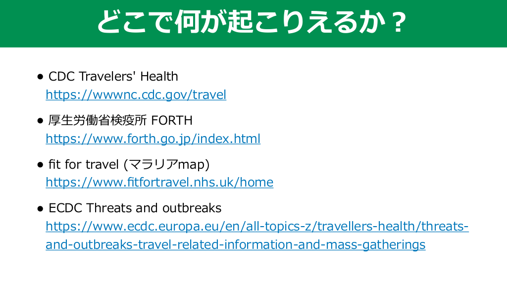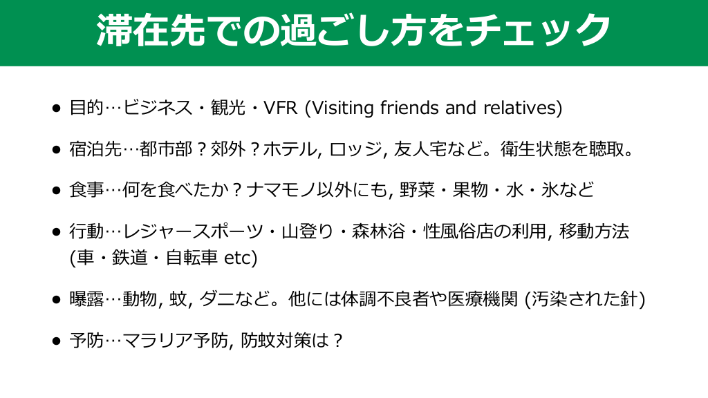 #8. 滞在先での過ごし⽅をチェック • ⽬的…ビジネス・観光・VFR (Visiting friends and relatives) • 宿泊先…都市部?郊外?ホテル, ロッジ, 友⼈宅など。衛⽣状態を聴取。 • ⾷事…何を⾷べたか?ナマモノ以外にも, 野菜・果物・⽔・氷など • ⾏動…レジャースポーツ・⼭登り・森林浴・性⾵俗店の利⽤, 移動⽅法 (⾞・鉄道・⾃転⾞ etc) • 曝露…動物, 蚊, ダニなど。他には体調不良者や医療機関 (汚染された針) • 予防…マラリア予防, 防蚊対策は?