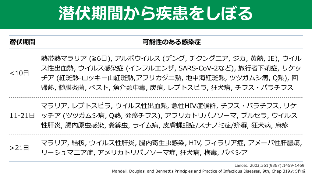 #22. 潜伏期間から疾患をしぼる 潜伏期間 <10⽇ 可能性のある感染症 熱帯熱マラリア (≧6⽇), アルボウイルス (デング, チクングニア, ジカ, ⻩熱, JE), ウイル ス性出⾎熱, ウイルス感染症 (インフルエンザ, SARS-CoV-2など), 旅⾏者下痢症, リケッ チア (紅斑熱-ロッキー⼭紅斑熱,アフリカダニ熱, 地中海紅斑熱, ツツガムシ病, Q熱), 回 帰熱, 髄膜炎菌, ペスト, ⿂介類中毒, 炭疽, レプトスピラ, 狂⽝病, チフス・パラチフス マラリア, レプトスピラ, ウイルス性出⾎熱, 急性HIV症候群, チフス・パラチフス, リケ 11-21⽇ ッチア (ツツガムシ病, Q熱, 発疹チフス), アフリカトリパノソーマ, ブルセラ, ウイルス 性肝炎, 腸内原⾍感染, 糞線⾍, ライム病, ⽪膚蝿蛆症/スナノミ症/疥癬, 狂⽝病, ⿇疹 >21⽇ マラリア, 結核, ウイルス性肝炎, 腸内寄⽣⾍感染, HIV, フィラリア症, アメーバ性肝膿瘍, リーシュマニア症, アメリカトリパノソーマ症, 狂⽝病, 梅毒, バベシア Lancet. 2003;361(9367):1459-1469. Mandell, Douglas, and Bennett's Principles and Practice of Infectious Diseases, 9th, Chap 319より作成