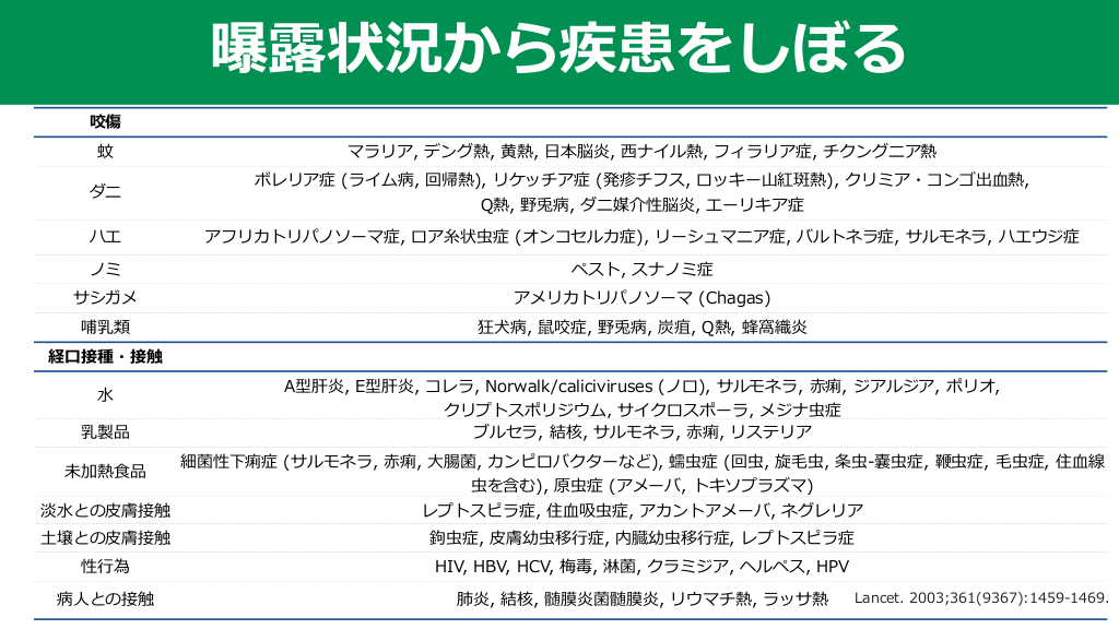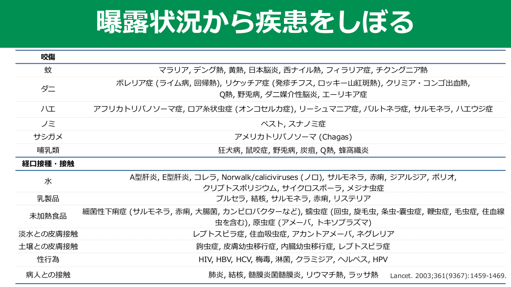 #14. 曝露状況から疾患をしぼる 咬傷 蚊 マラリア, デング熱, ⻩熱, ⽇本脳炎, ⻄ナイル熱, フィラリア症, チクングニア熱 ダニ ボレリア症 (ライム病, 回帰熱), リケッチア症 (発疹チフス, ロッキー⼭紅斑熱), クリミア・コンゴ出⾎熱, Q熱, 野兎病, ダニ媒介性脳炎, エーリキア症 ハエ アフリカトリパノソーマ症, ロア⽷状⾍症 (オンコセルカ症), リーシュマニア症, バルトネラ症, サルモネラ, ハエウジ症 ノミ ペスト, スナノミ症 サシガメ アメリカトリパノソーマ (Chagas) 哺乳類 狂⽝病, ⿏咬症, 野兎病, 炭疽, Q熱, 蜂窩織炎 経⼝接種・接触 ⽔ 乳製品 未加熱⾷品 A型肝炎, E型肝炎, コレラ, Norwalk/caliciviruses (ノロ), サルモネラ, ⾚痢, ジアルジア, ポリオ, クリプトスポリジウム, サイクロスポーラ, メジナ⾍症 ブルセラ, 結核, サルモネラ, ⾚痢, リステリア 細菌性下痢症 (サルモネラ, ⾚痢, ⼤腸菌, カンピロバクターなど), 蠕⾍症 (回⾍, 旋⽑⾍, 条⾍-嚢⾍症, 鞭⾍症, ⽑⾍症, 住⾎線 ⾍を含む), 原⾍症 (アメーバ, トキソプラズマ) 淡⽔との⽪膚接触 レプトスピラ症, 住⾎吸⾍症, アカントアメーバ, ネグレリア ⼟壌との⽪膚接触 鉤⾍症, ⽪膚幼⾍移⾏症, 内臓幼⾍移⾏症, レプトスピラ症 性⾏為 HIV, HBV, HCV, 梅毒, 淋菌, クラミジア, ヘルペス, HPV 病⼈との接触 肺炎, 結核, 髄膜炎菌髄膜炎, リウマチ熱, ラッサ熱 Lancet. 2003;361(9367):1459-1469.