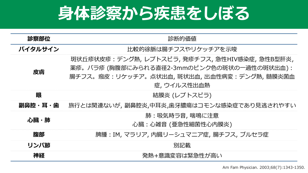 #15. ⾝体診察から疾患をしぼる 診察部位 診断的価値 バイタルサイン ⽐較的徐脈は腸チフスやリケッチアを⽰唆 ⽪膚 斑状丘疹状⽪疹:デング熱, レプトスピラ, 発疹チフス, 急性HIV感染症, 急性B型肝炎, 薬疹。バラ疹 (胸腹部にみられる直径2-3mmのピンク⾊の斑状の⼀過性の斑状出⾎): 腸チフス。痂⽪:リケッチア。点状出⾎, 斑状出⾎, 出⾎性病変:デング熱, 髄膜炎菌⾎ 症, ウイルス性出⾎熱 眼 結膜炎 (レプトスピラ) 副⿐腔・⽿・⻭ 旅⾏とは関連ないが, 副⿐腔炎,中⽿炎,⻭⽛膿瘍はコモンな感染症であり⾒逃されやすい ⼼臓・肺 肺:吸気時ラ⾳, 喘鳴に注意 ⼼臓:⼼雑⾳ (亜急性細菌性⼼内膜炎) 腹部 脾腫:IM, マラリア, 内臓リーシュマニア症, 腸チフス, ブルセラ症 リンパ節 別記載 神経 発熱+意識変容は緊急性が⾼い Am Fam Physician. 2003;68(7):1343-1350.