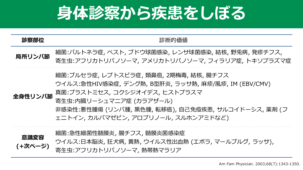 #16. ⾝体診察から疾患をしぼる 診察部位 診断的価値 細菌:バルトネラ症, ペスト, ブドウ球菌感染, レンサ球菌感染, 結核, 野兎病, 発疹チフス, 局所リンパ節 寄⽣⾍:アフリカトリパノソーマ, アメリカトリパノソーマ, フィラリア症, トキソプラズマ症 細菌:ブルセラ症, レプトスピラ症, 類⿐疽, 2期梅毒, 結核, 腸チフス ウイルス:急性HIV感染症, デング熱, B型肝炎, ラッサ熱, ⿇疹/⾵疹, IM (EBV/CMV) 真菌:ブラストミセス, コクシジオイデス, ヒストプラスマ 全⾝性リンパ節 寄⽣⾍:内臓リーシュマニア症 (カラアザール) ⾮感染性:悪性腫瘍 (リンパ腫, ⿊⾊腫, 転移癌), ⾃⼰免疫疾患, サルコイドーシス, 薬剤 (フ ェニトイン, カルバマゼピン, アロプリノール, スルホンアミドなど) 意識変容 (+次ページ) 細菌:急性細菌性髄膜炎, 腸チフス, 髄膜炎菌感染症 ウイルス:⽇本脳炎, 狂⽝病, ⻩熱, ウイルス性出⾎熱 (エボラ, マールブルグ, ラッサ), 寄⽣⾍:アフリカトリパノソーマ, 熱帯熱マラリア Am Fam Physician. 2003;68(7):1343-1350.