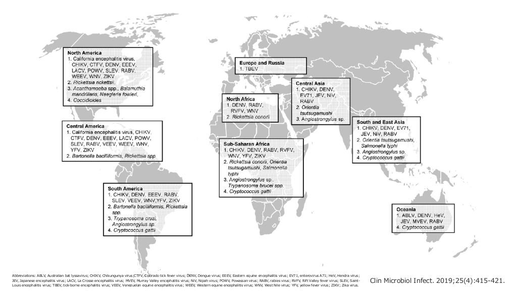 #17. Abbreviations: ABLV, Australian bat lyssavirus; CHIKV, Chikungunya virus;CTFV, Colorado tick fever virus; DENV, Dengue virus; EEEV, Eastern equine encephalitis virus; EV71, enterovirus A71; HeV, Hendra virus; JEV, Japanese encephalitis virus; LACV, La Crosse encephalitis virus; MVEV, Murray Valley encephalitis virus; NiV, Nipah virus; POWV, Powassan virus; RABV, rabies virus; RVFV, Rift Valley fever virus; SLEV, SaintLouis encephalitis virus; TBEV, tick-borne encephalitis virus; VEEV, Venezuelan equine encephalitis virus; WEEV, Western equine encephalitis virus; WNV, West Nile virus; YFV, yellow fever virus; ZIKV; Zika virus. Clin Microbiol Infect. 2019;25(4):415-421.