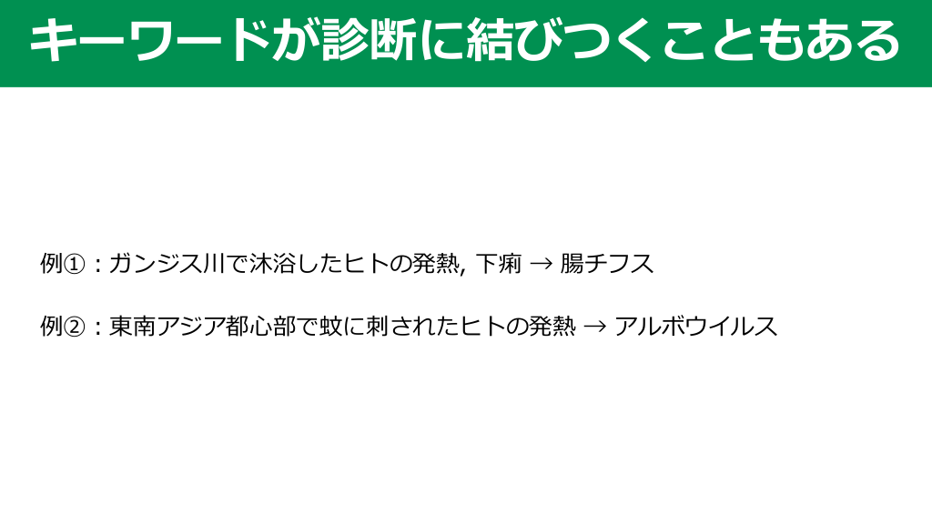 #18. キーワードが診断に結びつくこともある 例①:ガンジス川で沐浴したヒトの発熱, 下痢 → 腸チフス 例②:東南アジア都⼼部で蚊に刺されたヒトの発熱 → アルボウイルス