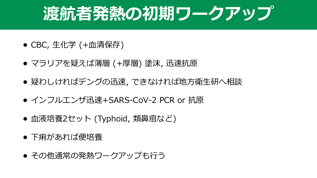 #19. 渡航者発熱の初期ワークアップ • CBC, ⽣化学 (+⾎清保存) • マラリアを疑えば薄層 (+厚層) 塗沫, 迅速抗原 • 疑わしければデングの迅速, できなければ地⽅衛⽣研へ相談 • インフルエンザ迅速+SARS-CoV-2 PCR or 抗原 • ⾎液培養2セット (Typhoid, 類⿐疽など) • 下痢があれば便培養 • その他通常の発熱ワークアップも⾏う