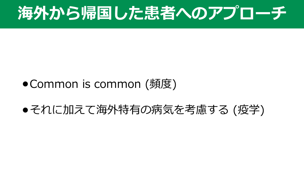 #2. 海外から帰国した患者へのアプローチ • Common is common (頻度) • それに加えて海外特有の病気を考慮する (疫学)