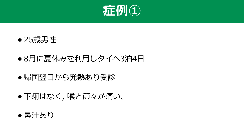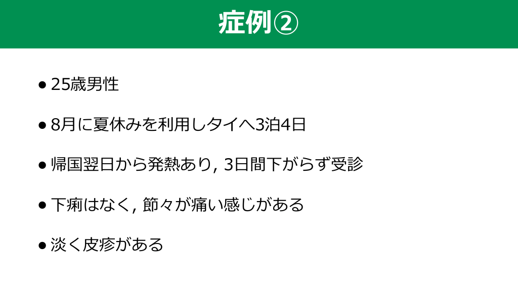 #26. 症例② • 25歳男性 • 8⽉に夏休みを利⽤しタイへ3泊4⽇ • 帰国翌⽇から発熱あり, 3⽇間下がらず受診 • 下痢はなく, 節々が痛い感じがある • 淡く⽪疹がある