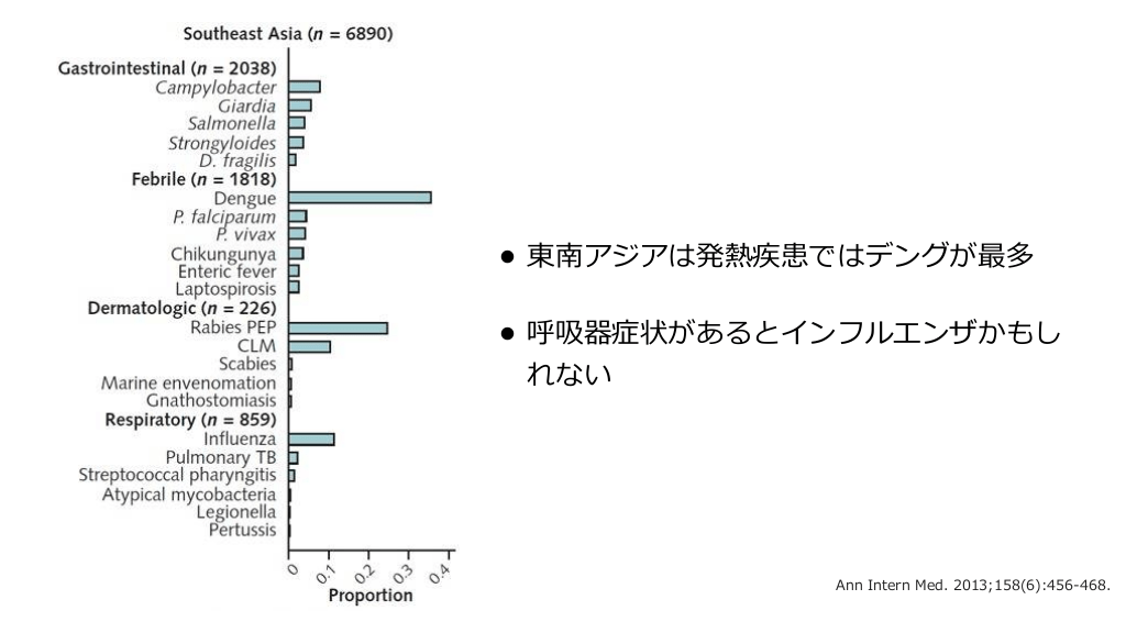#23. • 東南アジアは発熱疾患ではデングが最多 • 呼吸器症状があるとインフルエンザかもし れない Ann Intern Med. 2013;158(6):456-468.