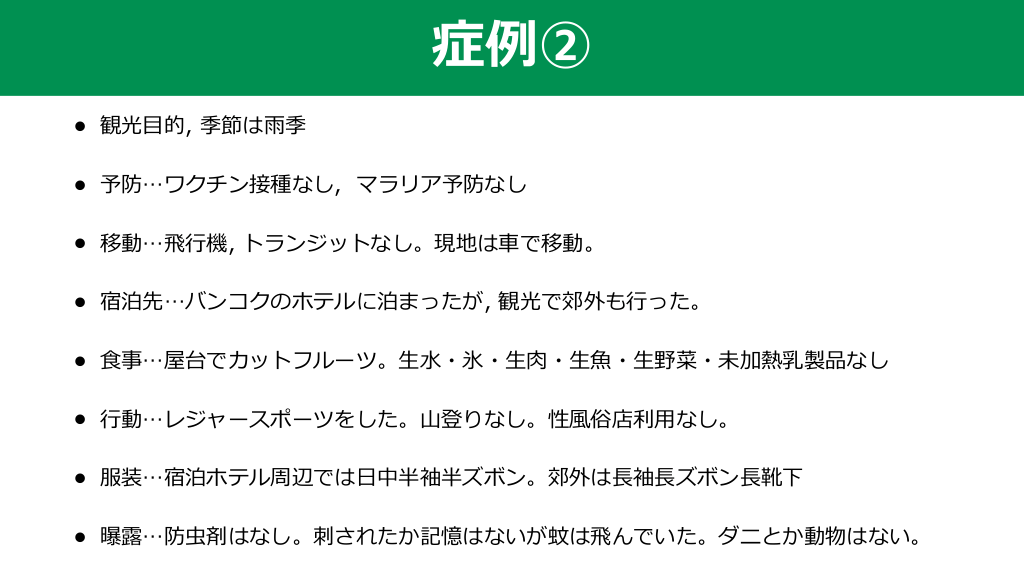 #21. 症例① • 観光⽬的, 季節は⾬季 • 予防…ワクチン接種なし, マラリア予防なし • 移動…⾶⾏機, トランジットなし。現地は⾞で移動。 • 宿泊先…バンコクのホテルに泊まったが, 観光で郊外も⾏った。 • ⾷事…屋台でカットフルーツ。⽣⽔・氷・⽣⾁・⽣⿂・⽣野菜・未加熱乳製品なし • ⾏動…レジャースポーツをした。⼭登りなし。性⾵俗店利⽤なし。 • 服装…宿泊ホテル周辺では⽇中半袖半ズボン。郊外は⻑袖⻑ズボン⻑靴下 • 曝露…防⾍剤はなし。刺されたか記憶はないが蚊は⾶んでいた。ダニとか動物はない。