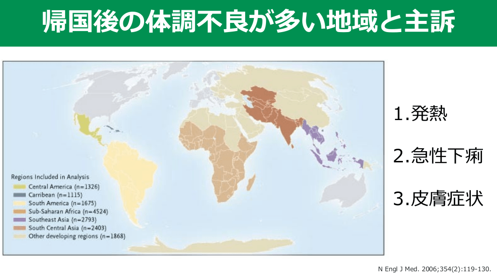 #3. 帰国後の体調不良が多い地域と主訴 1.発熱 2.急性下痢 3.⽪膚症状 N Engl J Med. 2006;354(2):119-130.