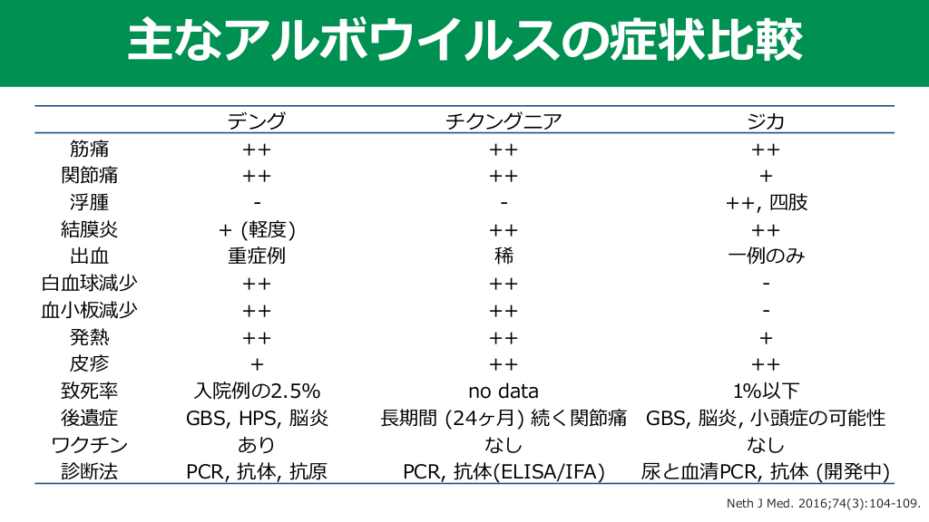 #30. 主なアルボウイルスの症状⽐較 筋痛 関節痛 浮腫 結膜炎 出⾎ ⽩⾎球減少 ⾎⼩板減少 発熱 ⽪疹 致死率 後遺症 ワクチン 診断法 デング ++ ++ + (軽度) 重症例 ++ ++ ++ + ⼊院例の2.5% GBS, HPS, 脳炎 あり PCR, 抗体, 抗原 チクングニア ジカ ++ ++ ++ + ++, 四肢 ++ ++ 稀 ⼀例のみ ++ ++ ++ + ++ ++ no data 1%以下 ⻑期間 (24ヶ⽉) 続く関節痛 GBS, 脳炎, ⼩頭症の可能性 なし なし PCR, 抗体(ELISA/IFA) 尿と⾎清PCR, 抗体 (開発中) Neth J Med. 2016;74(3):104-109.