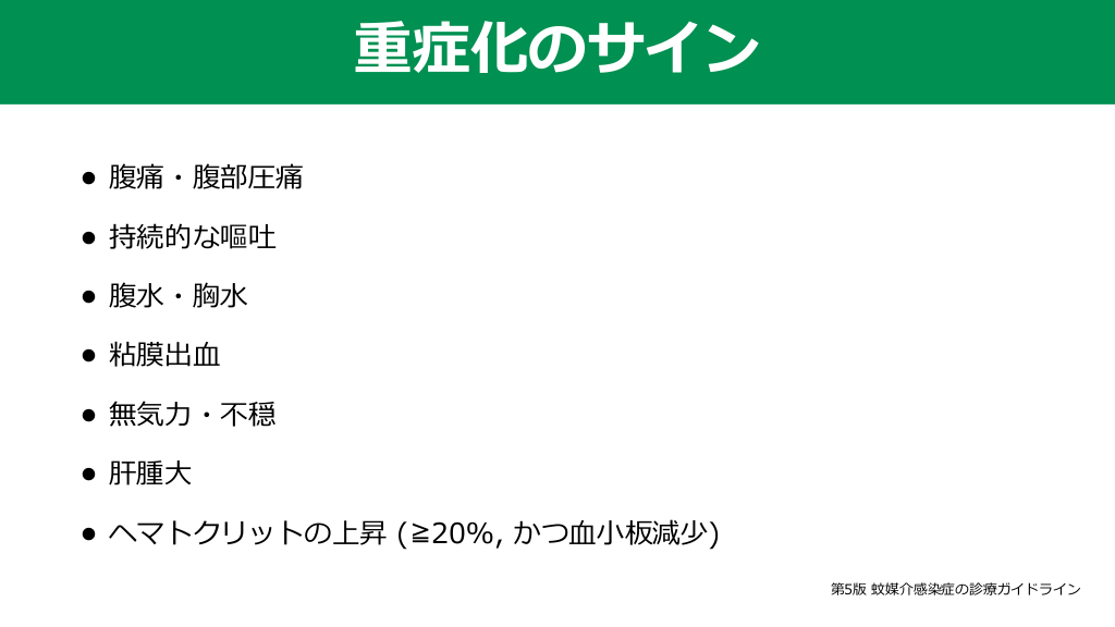 #37. 重症化のサイン • 腹痛・腹部圧痛 • 持続的な嘔吐 • 腹⽔・胸⽔ • 粘膜出⾎ • 無気⼒・不穏 • 肝腫⼤ • ヘマトクリットの上昇 (≧20%, かつ⾎⼩板減少) 第5版 蚊媒介感染症の診療ガイドライン