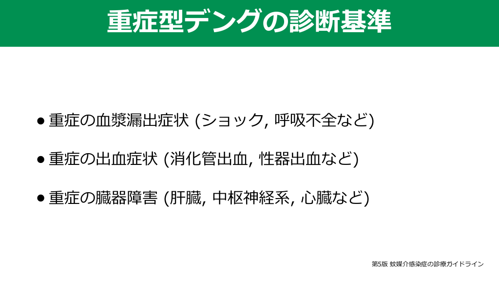 #38. 重症型デングの診断基準 • 重症の⾎漿漏出症状 (ショック, 呼吸不全など) • 重症の出⾎症状 (消化管出⾎, 性器出⾎など) • 重症の臓器障害 (肝臓, 中枢神経系, ⼼臓など) 第5版 蚊媒介感染症の診療ガイドライン