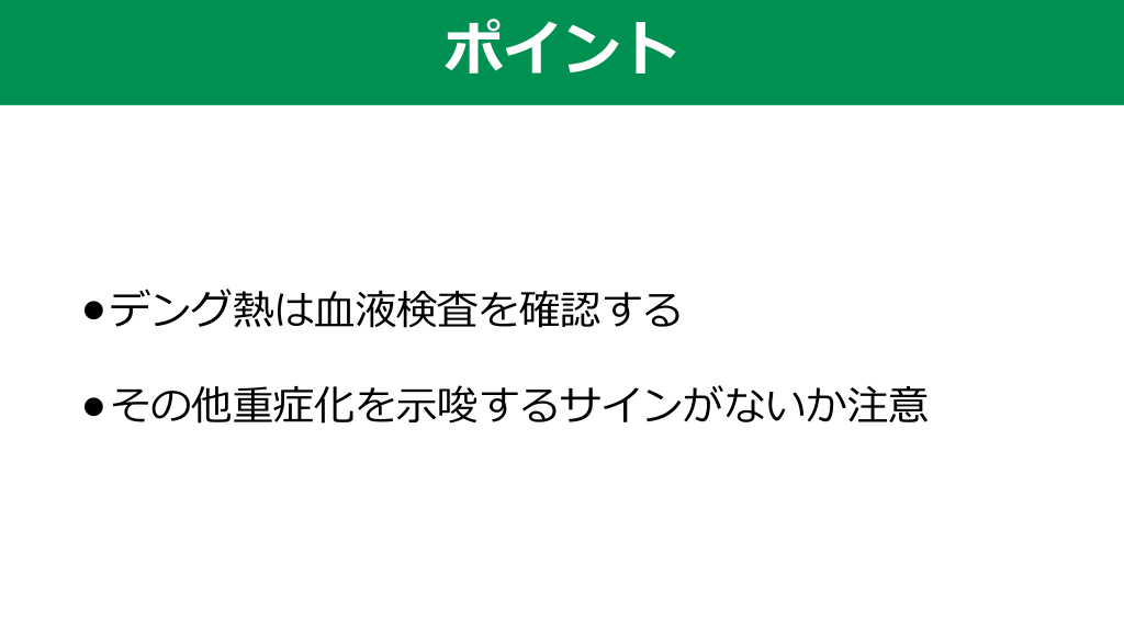#39. ポイント • デング熱は⾎液検査を確認する • その他重症化を⽰唆するサインがないか注意
