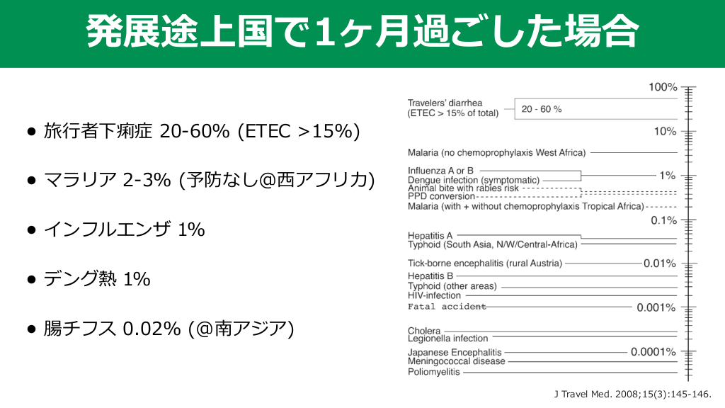 #4. 発展途上国で1ヶ⽉過ごした場合 • 旅⾏者下痢症 20-60% (ETEC >15%) • マラリア 2-3% (予防なし@⻄アフリカ) • インフルエンザ 1% • デング熱 1% • 腸チフス 0.02% (@南アジア) J Travel Med. 2008;15(3):145-146.