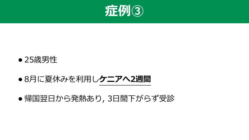 #40. 症例③ • 25歳男性 • 8⽉に夏休みを利⽤しケニアへ2週間 • 帰国翌⽇から発熱あり, 3⽇間下がらず受診