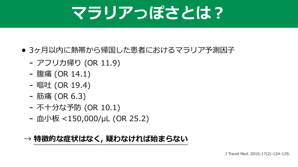 #43. マラリアっぽさとは? • 3ヶ⽉以内に熱帯から帰国した患者におけるマラリア予測因⼦ - アフリカ帰り (OR 11.9) 腹痛 (OR 14.1) 嘔吐 (OR 19.4) 筋痛 (OR 6.3) 不⼗分な予防 (OR 10.1) ⾎⼩板 <150,000/μL (OR 25.2) → 特徴的な症状はなく, 疑わなければ始まらない J Travel Med. 2010;17(2):124-129.