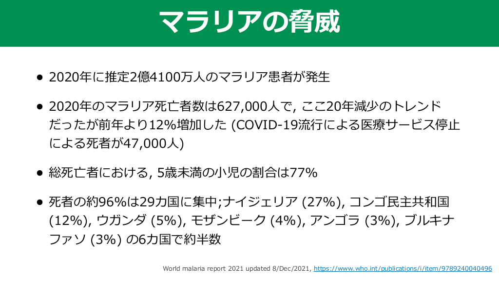 #44. マラリアの脅威 • 2020年に推定2億4100万⼈のマラリア患者が発⽣ • 2020年のマラリア死亡者数は627,000⼈で, ここ20年減少のトレンド だったが前年より12%増加した (COVID-19流⾏による医療サービス停⽌ による死者が47,000⼈) • 総死亡者における, 5歳未満の⼩児の割合は77% • 死者の約96%は29カ国に集中;ナイジェリア (27%), コンゴ⺠主共和国 (12%), ウガンダ (5%), モザンビーク (4%), アンゴラ (3%), ブルキナ ファソ (3%) の6カ国で約半数 World malaria report 2021 updated 8/Dec/2021, https://www.who.int/publications/i/item/9789240040496
