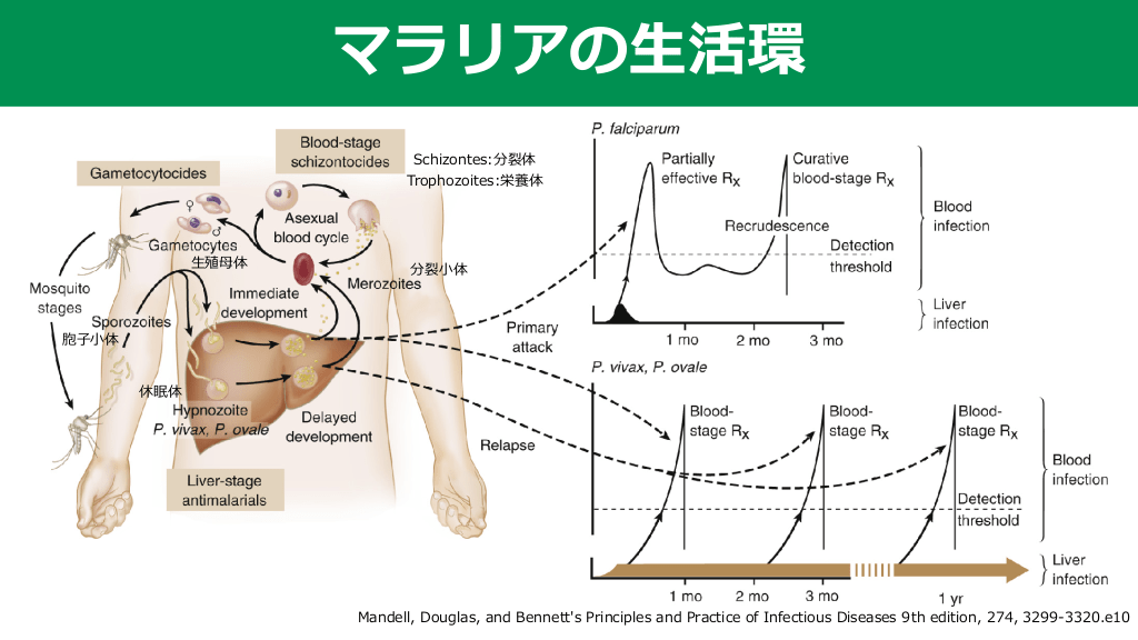 #46. マラリアの⽣活環 Schizontes:分裂体 Trophozoites:栄養体 ⽣殖⺟体 分裂⼩体 胞⼦⼩体 休眠体 Mandell, Douglas, and Bennett's Principles and Practice of Infectious Diseases 9th edition, 274, 3299-3320.e10