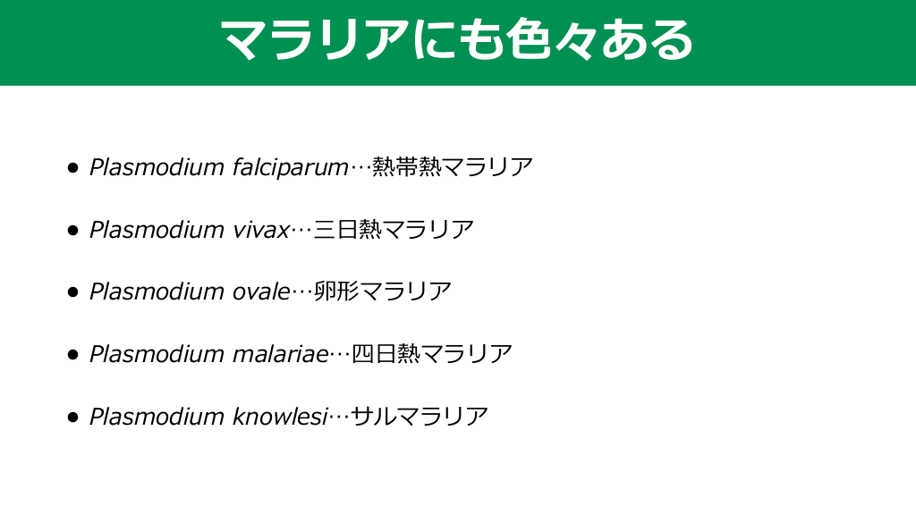 #47. マラリアにも⾊々ある • Plasmodium falciparum…熱帯熱マラリア • Plasmodium vivax…三⽇熱マラリア • Plasmodium ovale…卵形マラリア • Plasmodium malariae…四⽇熱マラリア • Plasmodium knowlesi…サルマラリア
