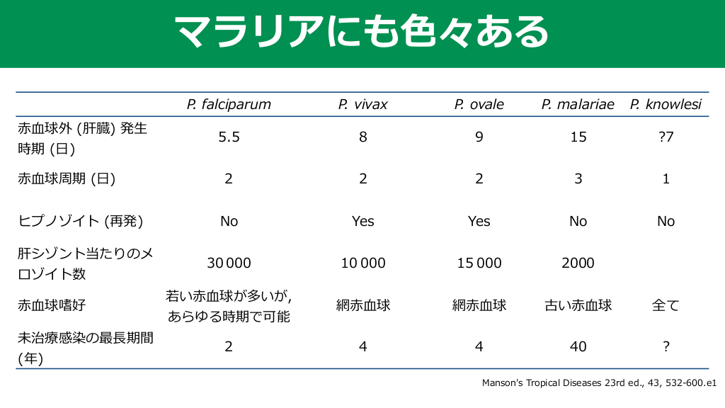 #48. マラリアにも⾊々ある ⾚⾎球外 (肝臓) 発⽣ 時期 (⽇) ⾚⾎球周期 (⽇) ヒプノゾイト (再発) 肝シゾント当たりのメ ロゾイト数 ⾚⾎球嗜好 未治療感染の最⻑期間 (年) P. falciparum P. vivax P. ovale P. malariae P. knowlesi 5.5 8 9 15 ?7 2 2 2 3 1 No Yes Yes No No 30 000 10 000 15 000 2000 若い⾚⾎球が多いが, あらゆる時期で可能 網⾚⾎球 網⾚⾎球 古い⾚⾎球 全て 2 4 4 40 ? Manson's Tropical Diseases 23rd ed., 43, 532-600.e1