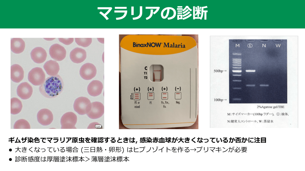 #49. マラリアの診断 ギムザ染⾊でマラリア原⾍を確認するときは, 感染⾚⾎球が⼤きくなっているか否かに注⽬ • ⼤きくなっている場合 (三⽇熱・卵形) はヒプノゾイトを作る→プリマキンが必要 • 診断感度は厚層塗沫標本>薄層塗沫標本