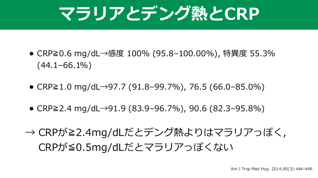 #51. マラリアとデング熱とCRP • CRP≧0.6 mg/dL→感度 100% (95.8–100.00%), 特異度 55.3% (44.1–66.1%) • CRP≧1.0 mg/dL→97.7 (91.8–99.7%), 76.5 (66.0–85.0%) • CRP≧2.4 mg/dL→91.9 (83.9–96.7%), 90.6 (82.3–95.8%) → CRPが≧2.4mg/dLだとデング熱よりはマラリアっぽく, CRPが≦0.5mg/dLだとマラリアっぽくない Am J Trop Med Hyg. 2014;90(3):444-448.