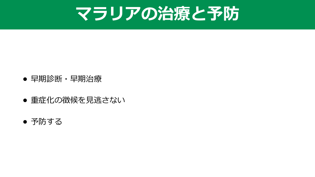 #52. マラリアの治療と予防 • 早期診断・早期治療 • 重症化の徴候を⾒逃さない • 予防する