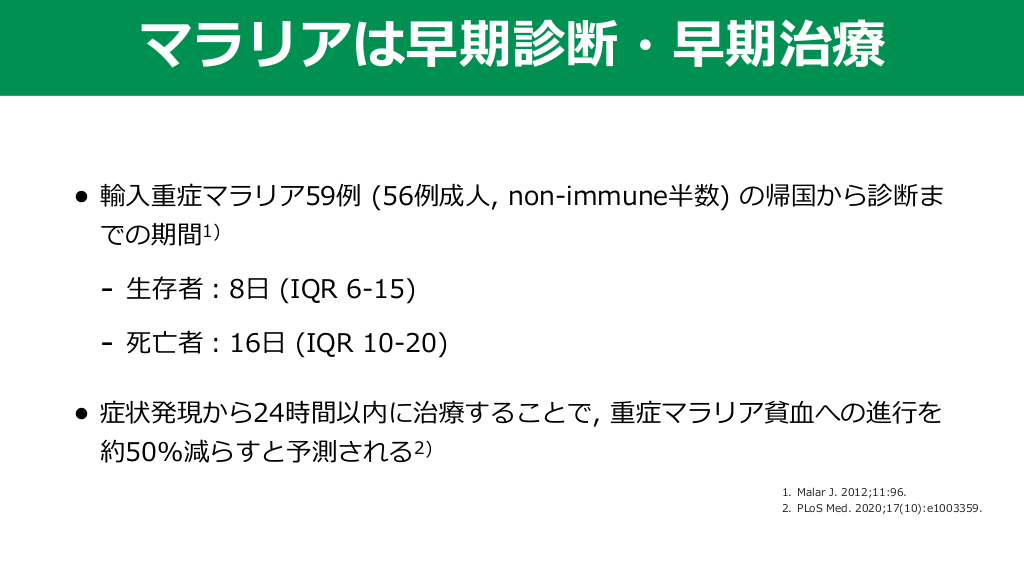 #53. マラリアは早期診断・早期治療 • • 輸⼊重症マラリア59例 (56例成⼈, non-immune半数) の帰国から診断ま での期間1) - ⽣存者:8⽇ (IQR 6-15) - 死亡者:16⽇ (IQR 10-20) 症状発現から24時間以内に治療することで, 重症マラリア貧⾎への進⾏を 約50%減らすと予測される2) 1. Malar J. 2012;11:96. 2. PLoS Med. 2020;17(10):e1003359.
