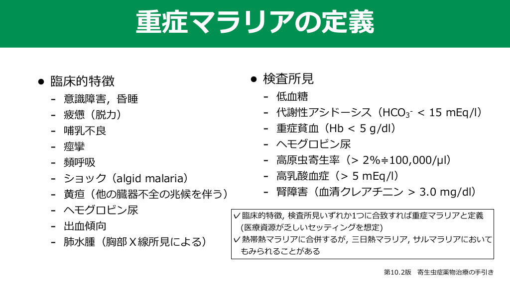 #54. 重症マラリアの定義 • • 検査所⾒ 臨床的特徴 - 低⾎糖 - 意識障害,昏睡 - < 15 mEq/l) 代謝性アシドーシス(HCO 3 - 疲憊(脱⼒) - 重症貧⾎(Hb < 5 g/dl) - 哺乳不良 - ヘモグロビン尿 - 痙攣 - ⾼原⾍寄⽣率(> 2%≑100,000/μl) - 頻呼吸 - ⾼乳酸⾎症(> 5 mEq/l) - ショック(algid malaria) - 腎障害(⾎清クレアチニン > 3.0 mg/dl) - ⻩疸(他の臓器不全の兆候を伴う) - ヘモグロビン尿 ✓臨床的特徴, 検査所⾒いずれか1つに合致すれば重症マラリアと定義 (医療資源が乏しいセッティングを想定) - 出⾎傾向 熱帯熱マラリアに合併するが, 三⽇熱マラリア, サルマラリアにおいて ✓ - 肺⽔腫(胸部X線所⾒による) もみられることがある 第10.2版 寄⽣⾍症薬物治療の⼿引き