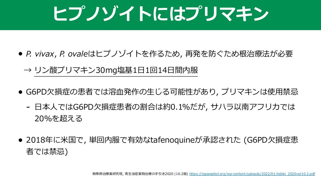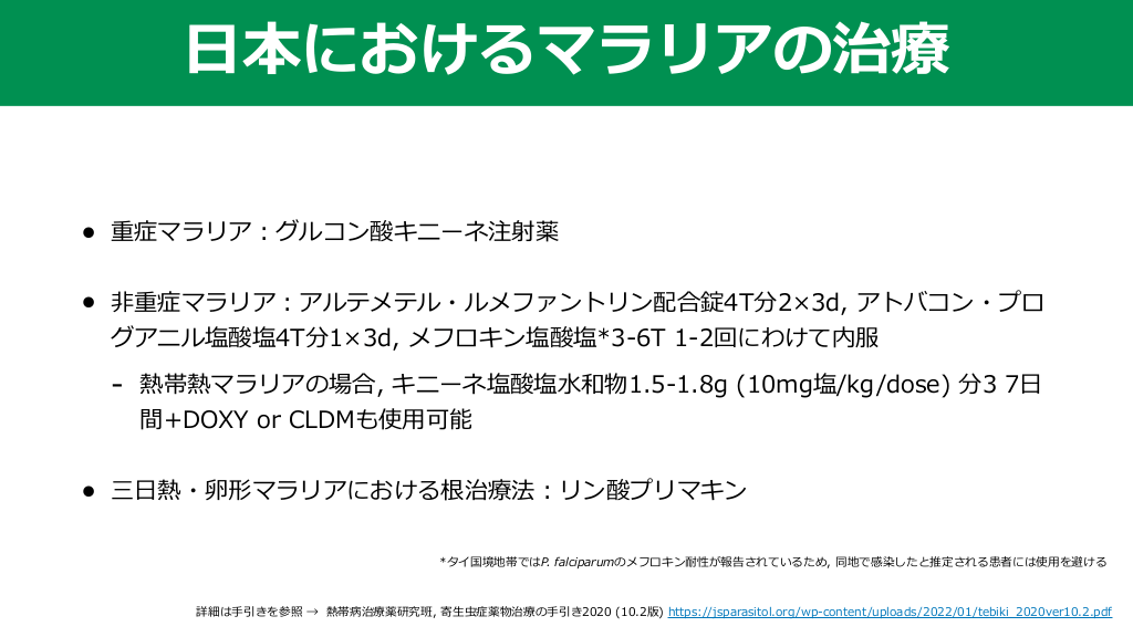 #55. ⽇本におけるマラリアの治療 • 重症マラリア:グルコン酸キニーネ注射薬 • ⾮重症マラリア:アルテメテル・ルメファントリン配合錠4T分2×3d, アトバコン・プロ グアニル塩酸塩4T分1×3d, メフロキン塩酸塩*3-6T 1-2回にわけて内服 • 熱帯熱マラリアの場合, キニーネ塩酸塩⽔和物1.5-1.8g (10mg塩/kg/dose) 分3 7⽇ 間+DOXY or CLDMも使⽤可能 三⽇熱・卵形マラリアにおける根治療法:リン酸プリマキン *タイ国境地帯ではP. falciparumのメフロキン耐性が報告されているため, 同地で感染したと推定される患者には使⽤を避ける 詳細は⼿引きを参照 → 熱帯病治療薬研究班, 寄⽣⾍症薬物治療の⼿引き2020 (10.2版) https://jsparasitol.org/wp-content/uploads/2022/01/tebiki_2020ver10.2.pdf