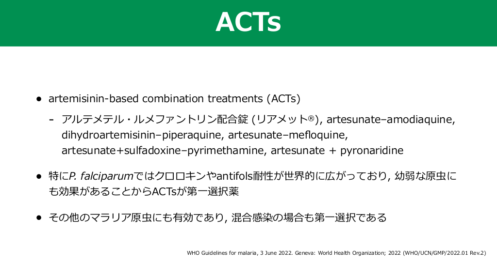 #56. ACTs • artemisinin-based combination treatments (ACTs) - アルテメテル・ルメファントリン配合錠 (リアメット ), artesunate–amodiaquine, dihydroartemisinin–piperaquine, artesunate–me oquine, artesunate+sulfadoxine–pyrimethamine, artesunate + pyronaridine • 特にP. falciparumではクロロキンやantifols耐性が世界的に広がっており, 幼弱な原⾍に も効果があることからACTsが第⼀選択薬 • その他のマラリア原⾍にも有効であり, 混合感染の場合も第⼀選択である fl ®︎ WHO Guidelines for malaria, 3 June 2022. Geneva: World Health Organization; 2022 (WHO/UCN/GMP/2022.01 Rev.2)