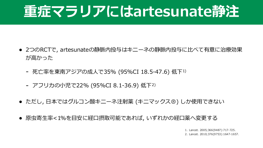 #57. 重症マラリアにはartesunate静注 • 2つのRCTで, artesunateの静脈内投与はキニーネの静脈内投与に⽐べて有意に治療効果 が⾼かった - 死亡率を東南アジアの成⼈で35% (95%CI 18.5-47.6) 低下1) - アフリカの⼩児で22% (95%CI 8.1-36.9) 低下2) • ただし, ⽇本ではグルコン酸キニーネ注射薬 (キニマックス®) しか使⽤できない • 原⾍寄⽣率<1%を⽬安に経⼝摂取可能であれば, いずれかの経⼝薬へ変更する 1. Lancet. 2005;366(9487):717-725. 2. Lancet. 2010;376(9753):1647-1657.