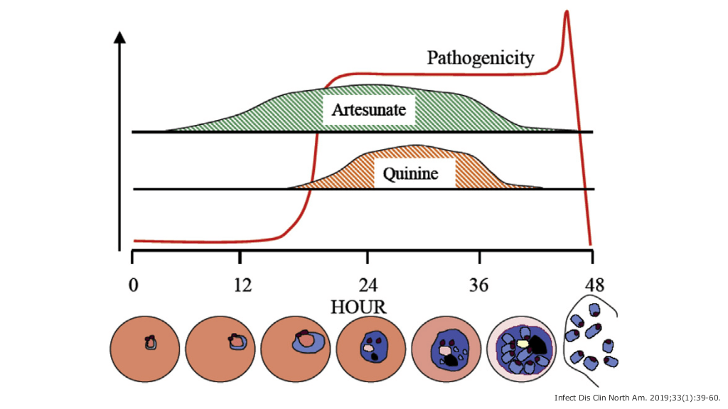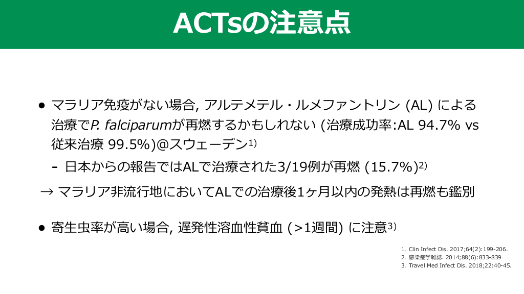 #59. ACTsの注意点 • マラリア免疫がない場合, アルテメテル・ルメファントリン (AL) による 治療でP. falciparumが再燃するかもしれない (治療成功率:AL 94.7% vs 従来治療 99.5%)@スウェーデン1) - ⽇本からの報告ではALで治療された3/19例が再燃 (15.7%)2) → マラリア⾮流⾏地においてALでの治療後1ヶ⽉以内の発熱は再燃も鑑別 • 寄⽣⾍率が⾼い場合, 遅発性溶⾎性貧⾎ (>1週間) に注意3) 1. Clin Infect Dis. 2017;64(2):199-206. 2. 感染症学雑誌. 2014;88(6):833-839 3. Travel Med Infect Dis. 2018;22:40-45.