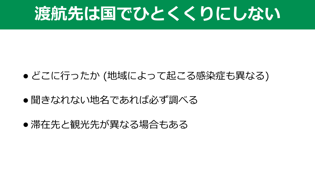 #6. 渡航先は国でひとくくりにしない • どこに⾏ったか (地域によって起こる感染症も異なる) • 聞きなれない地名であれば必ず調べる • 滞在先と観光先が異なる場合もある