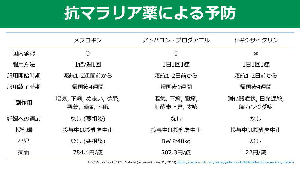 #62. 抗マラリア薬による予防 メフロキン アトバコン・プログアニル ドキシサイクリン 国内承認 ○ ○ ✖ 服⽤⽅法 1錠/週1回 1⽇1回1錠 1⽇1回1錠 服⽤開始時期 渡航1-2週間前から 渡航1-2⽇前から 渡航1-2⽇前から 服⽤終了時期 帰国後4週間 帰国後1週間 帰国後4週間 副作⽤ 嘔気, 下痢, めまい, 徐脈, 悪夢, 頭痛, 不眠 嘔気, 下痢, 腹痛, 肝酵素上昇, ⽪疹 消化器症状, ⽇光過敏, 膣カンジダ症 妊婦への適応 なし (要相談) なし なし 授乳婦 投与中は授乳を中⽌ 投与中は授乳を中⽌ 投与中は授乳を中⽌ ⼩児 なし (要相談) BW ≧40kg なし 薬価 784.4円/錠 507.3円/錠 22円/錠 CDC Yellow Book 2024, Malaria (accessed June 21, 2023) https://wwwnc.cdc.gov/travel/yellowbook/2024/infections-diseases/malaria