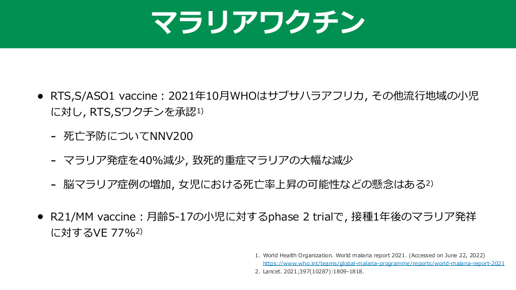 #64. マラリアワクチン • • RTS,S/ASO1 vaccine:2021年10⽉WHOはサブサハラアフリカ, その他流⾏地域の⼩児 に対し, RTS,Sワクチンを承認1) - 死亡予防についてNNV200 - マラリア発症を40%減少, 致死的重症マラリアの⼤幅な減少 - 脳マラリア症例の増加, ⼥児における死亡率上昇の可能性などの懸念はある2) R21/MM vaccine:⽉齢5-17の⼩児に対するphase 2 trialで, 接種1年後のマラリア発祥 に対するVE 77%2) 1. World Health Organization. World malaria report 2021. (Accessed on June 22, 2022) https://www.who.int/teams/global-malaria-programme/reports/world-malaria-report-2021 2. Lancet. 2021;397(10287):1809-1818.