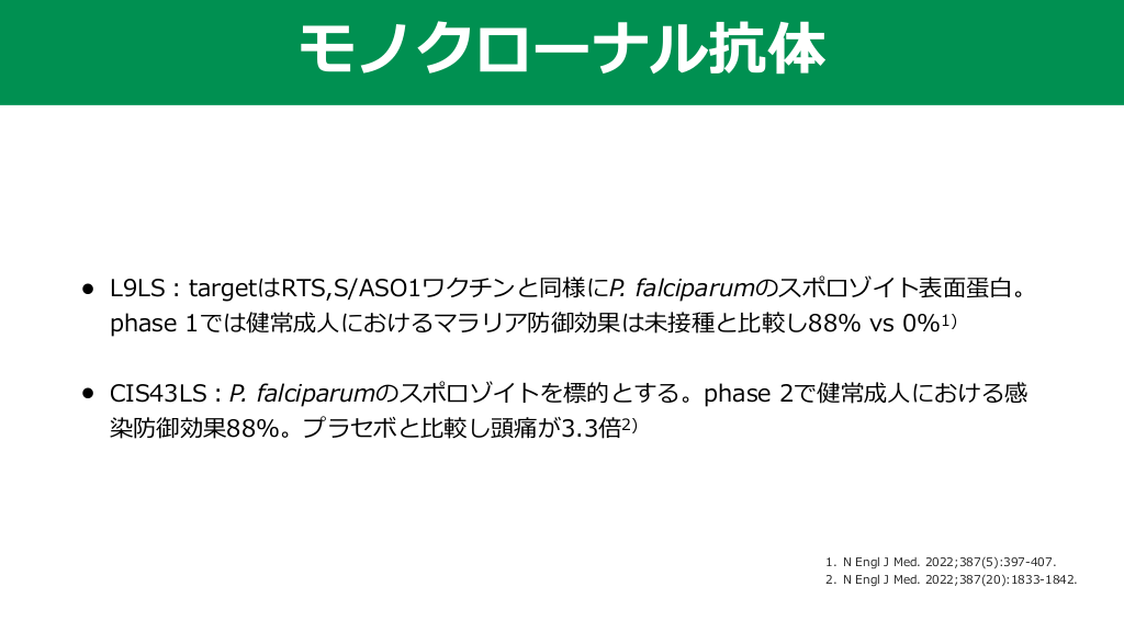 #65. モノクローナル抗体 • L9LS:targetはRTS,S/ASO1ワクチンと同様にP. falciparumのスポロゾイト表⾯蛋⽩。 phase 1では健常成⼈におけるマラリア防御効果は未接種と⽐較し88% vs 0%1) • CIS43LS:P. falciparumのスポロゾイトを標的とする。phase 2で健常成⼈における感 染防御効果88%。プラセボと⽐較し頭痛が3.3倍2) 1. N Engl J Med. 2022;387(5):397-407. 2. N Engl J Med. 2022;387(20):1833-1842.
