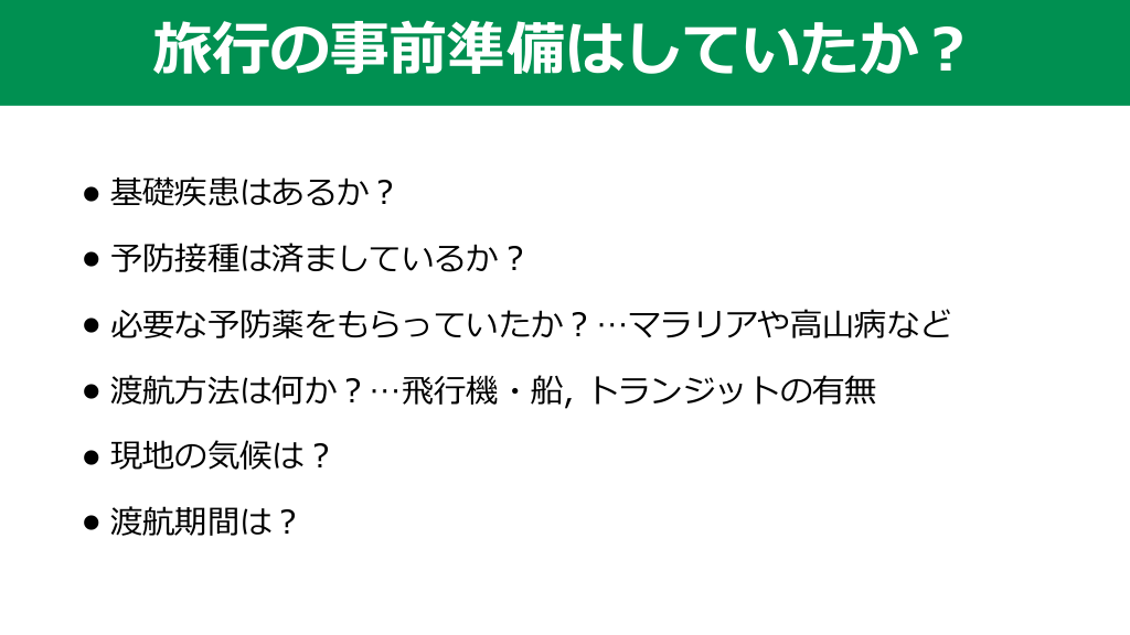 #7. 旅⾏の事前準備はしていたか? • 基礎疾患はあるか? • 予防接種は済ましているか? • 必要な予防薬をもらっていたか?…マラリアや⾼⼭病など • 渡航⽅法は何か?…⾶⾏機・船, トランジットの有無 • 現地の気候は? • 渡航期間は?