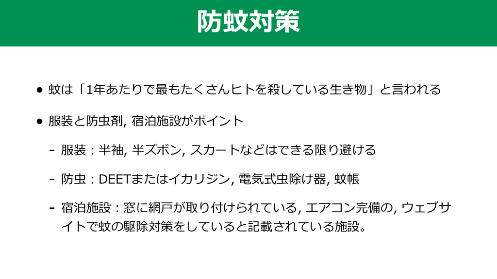 #9. 防蚊対策 • 蚊は「1年あたりで最もたくさんヒトを殺している⽣き物」と⾔われる • 服装と防⾍剤, 宿泊施設がポイント - 服装:半袖, 半ズボン, スカートなどはできる限り避ける - 防⾍:DEETまたはイカリジン, 電気式⾍除け器, 蚊帳 - 宿泊施設:窓に網⼾が取り付けられている, エアコン完備の, ウェブサ イトで蚊の駆除対策をしていると記載されている施設。