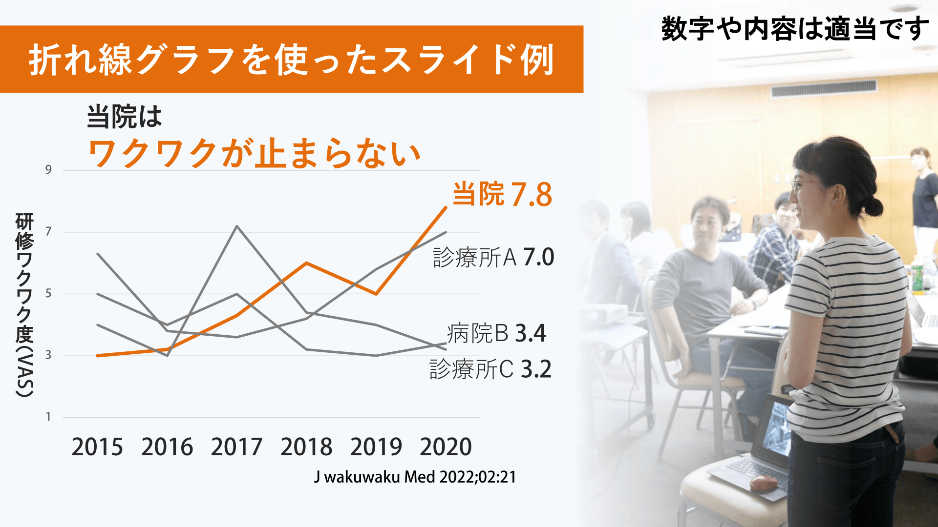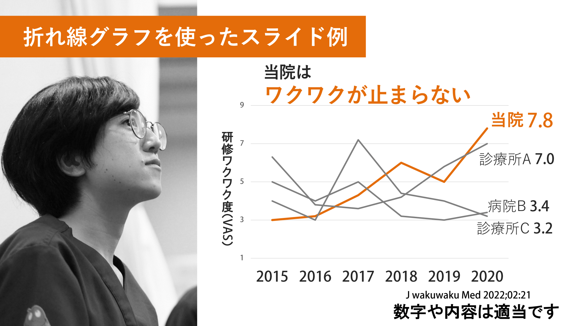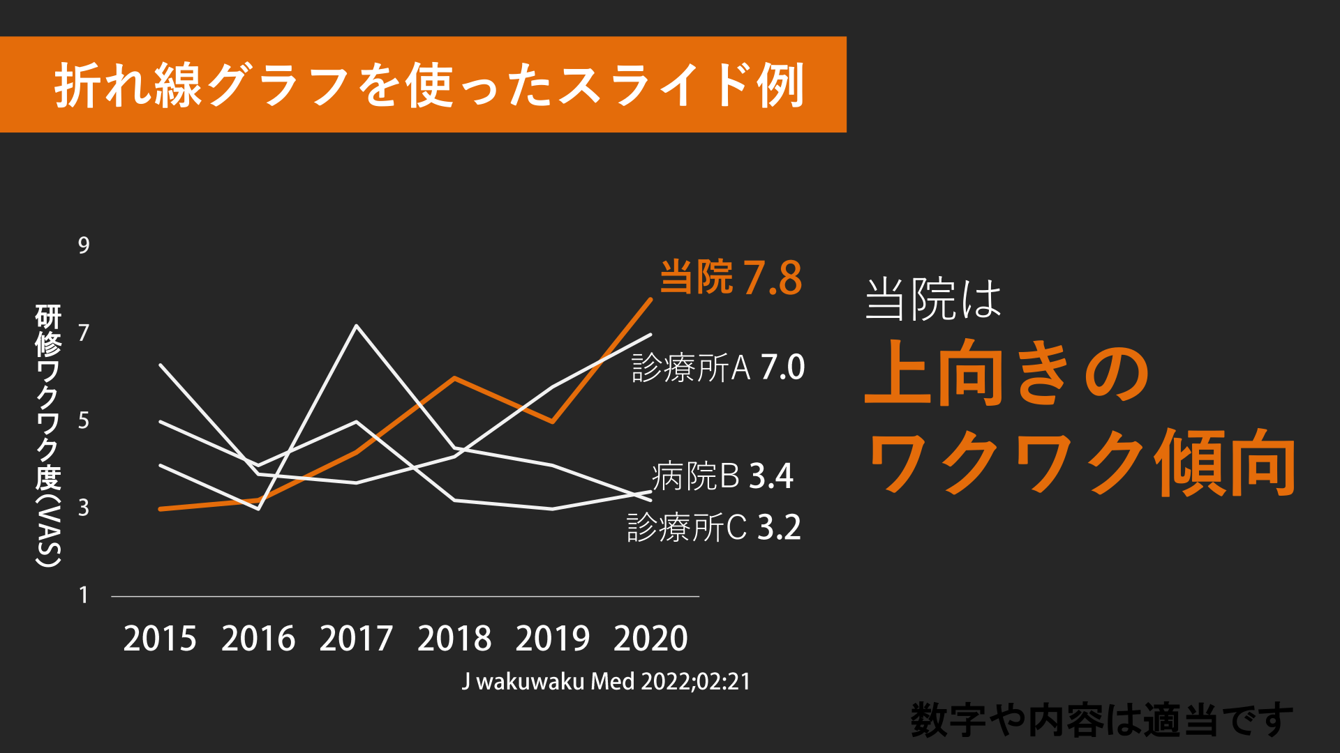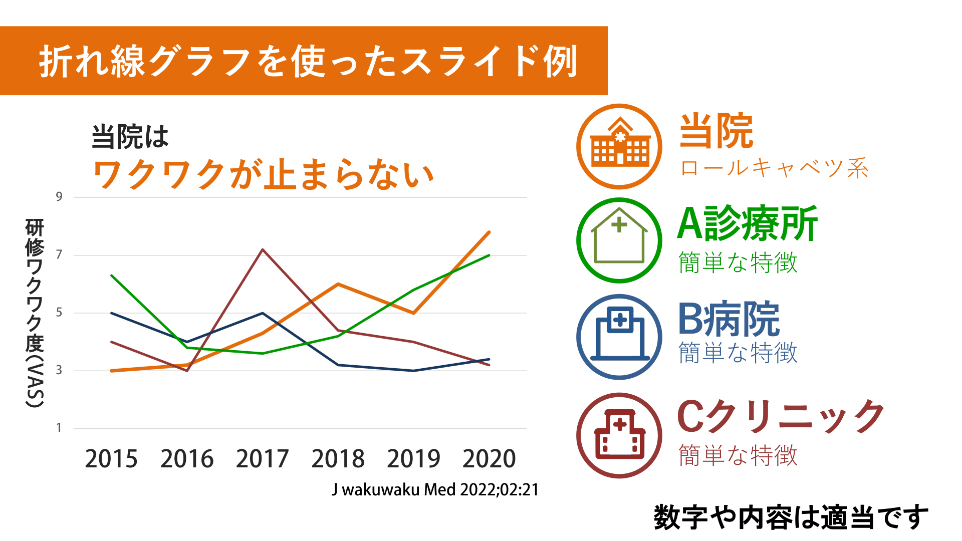 #10. 折れ線グラフを使ったスライド例 当院は ワクワクが止まらない 当院 研 修 ワ ク ワ ク 度 ( ) 診療所A 病院B 診療所C 数字や内容は適当です