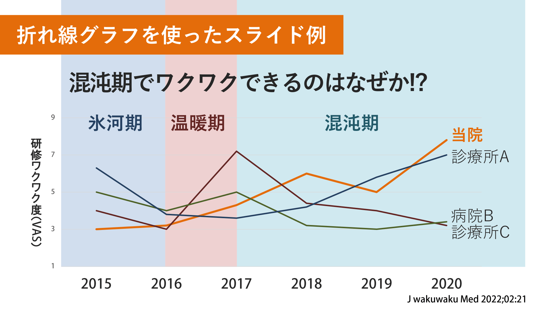 #11. 折れ線グラフを使ったスライド例 混沌期でワクワクできるのはなぜか!? 氷河期 研 修 ワ ク ワ ク 度 ( ) 温暖期 混沌期 当院 診療所A 病院B 診療所C