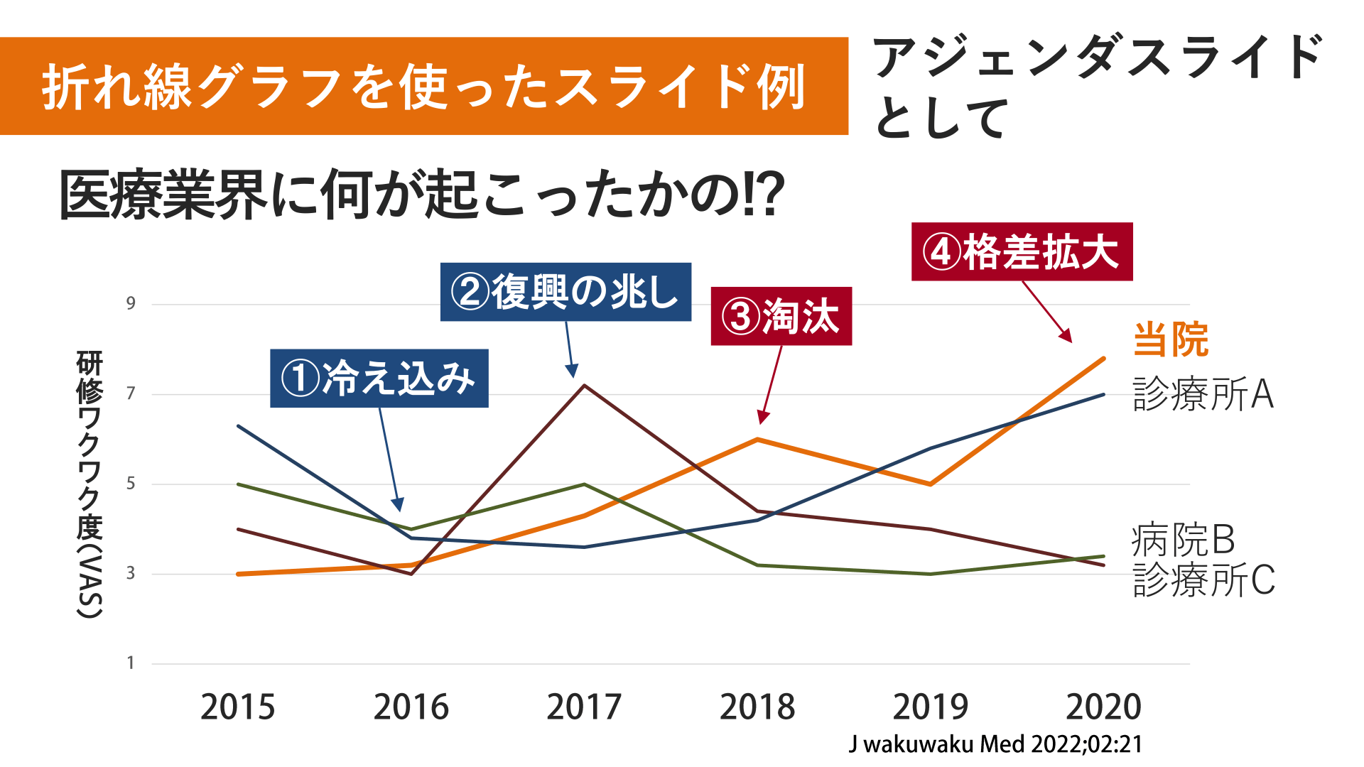 #12. 折れ線グラフを使ったスライド例 アジェンダスライド として 医療業界に何が起こったかの!? ④格差拡大 ②復興の兆し 研 修 ワ ク ワ ク 度 ( ) ①冷え込み ③淘汰 当院 診療所A 病院B 診療所C