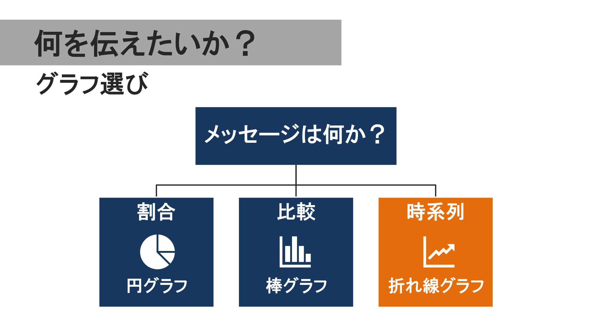 #2. 何を伝えたいか? グラフ選び メッセージは何か? メッセージは何か? 割合 比較 時系列 円グラフ 棒グラフ 折れ線グラフ