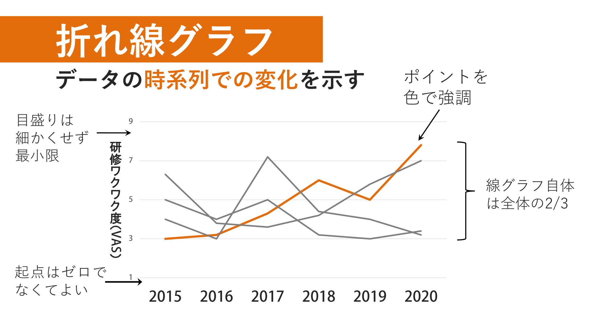 #3. 折れ線グラフ データの時系列での変化を示す 目盛りは 細かくせず 最小限 起点はゼロで なくてよい 研 修 ワ ク ワ ク 度 ( ) ポイントを 色で強調 線グラフ自体 は全体の2/3