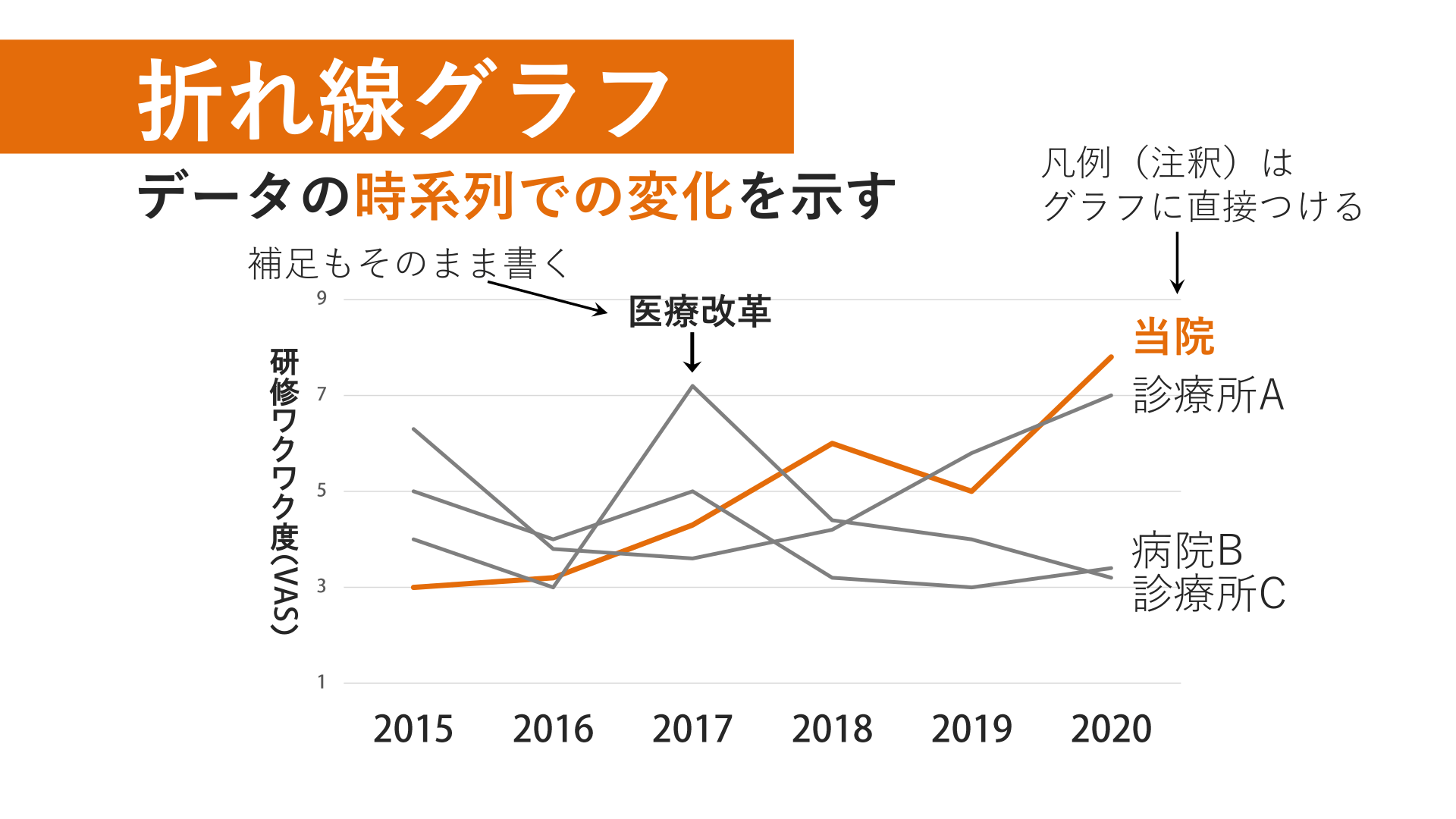 #4. 折れ線グラフ データの時系列での変化を示す 凡例(注釈)は グラフに直接つける 補足もそのまま書く 医療改革 研 修 ワ ク ワ ク 度 ( ) 当院 診療所A 病院B 診療所C
