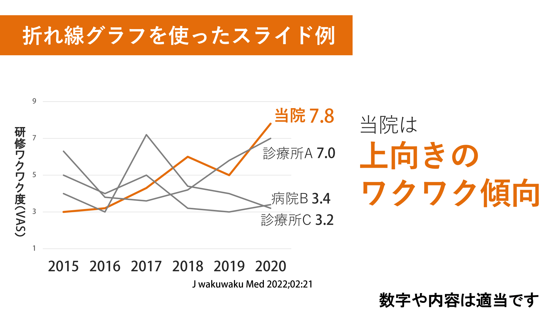 #7. 折れ線グラフを使ったスライド例 当院 研 修 ワ ク ワ ク 度 ( 診療所A 病院B 当院は 上向きの ワクワク傾向 診療所C ) 数字や内容は適当です