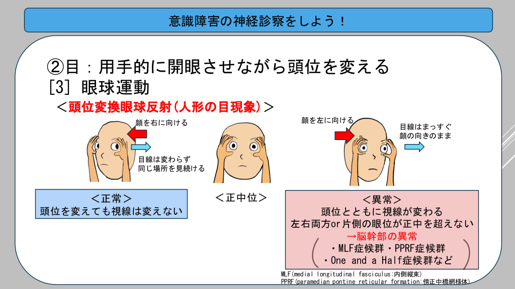 #10. 意識障害の神経診察をしよう! ②目:用手的に開眼させながら頭位を変える [3] 眼球運動 <頭位変換眼球反射(人形の目現象)> 顔を左に向ける 顔を右に向ける 目線はまっすぐ 顔の向きのまま 目線は変わらず 同じ場所を見続ける <正常> 頭位を変えても視線は変えない <正中位> <異常> 頭位とともに視線が変わる 左右両方or片側の眼位が正中を超えない →脳幹部の異常 ・MLF症候群・PPRF症候群 ・One and a Half症候群など MLF(medial longitudinal fasciculus:内側縦束) PPRF(paramedian pontine reticular formation:傍正中橋網様体)