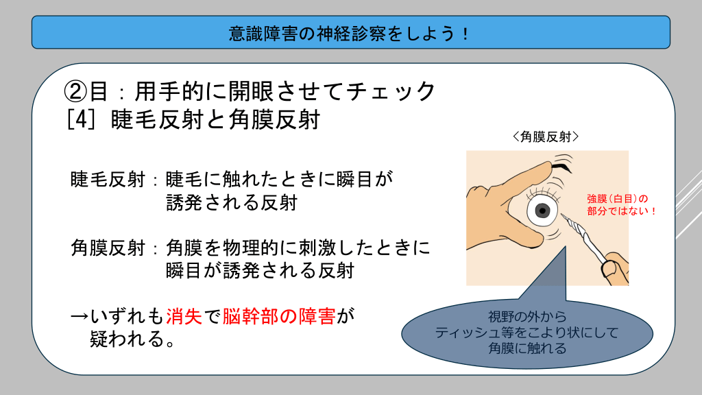 #11. 意識障害の神経診察をしよう! ②目:用手的に開眼させてチェック [4] 睫毛反射と角膜反射 睫毛反射:睫毛に触れたときに瞬目が 誘発される反射 <角膜反射> 強膜(白目)の 部分ではない! 角膜反射:角膜を物理的に刺激したときに 瞬目が誘発される反射 →いずれも消失で脳幹部の障害が 疑われる。 視野の外から ティッシュ等をこより状にして 角膜に触れる